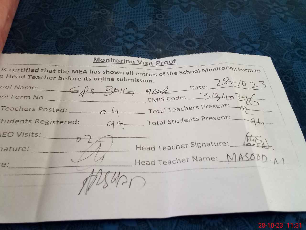 | EMIS Code: 31340296 | Name of School: GPS BAIG MEHAR | |||
