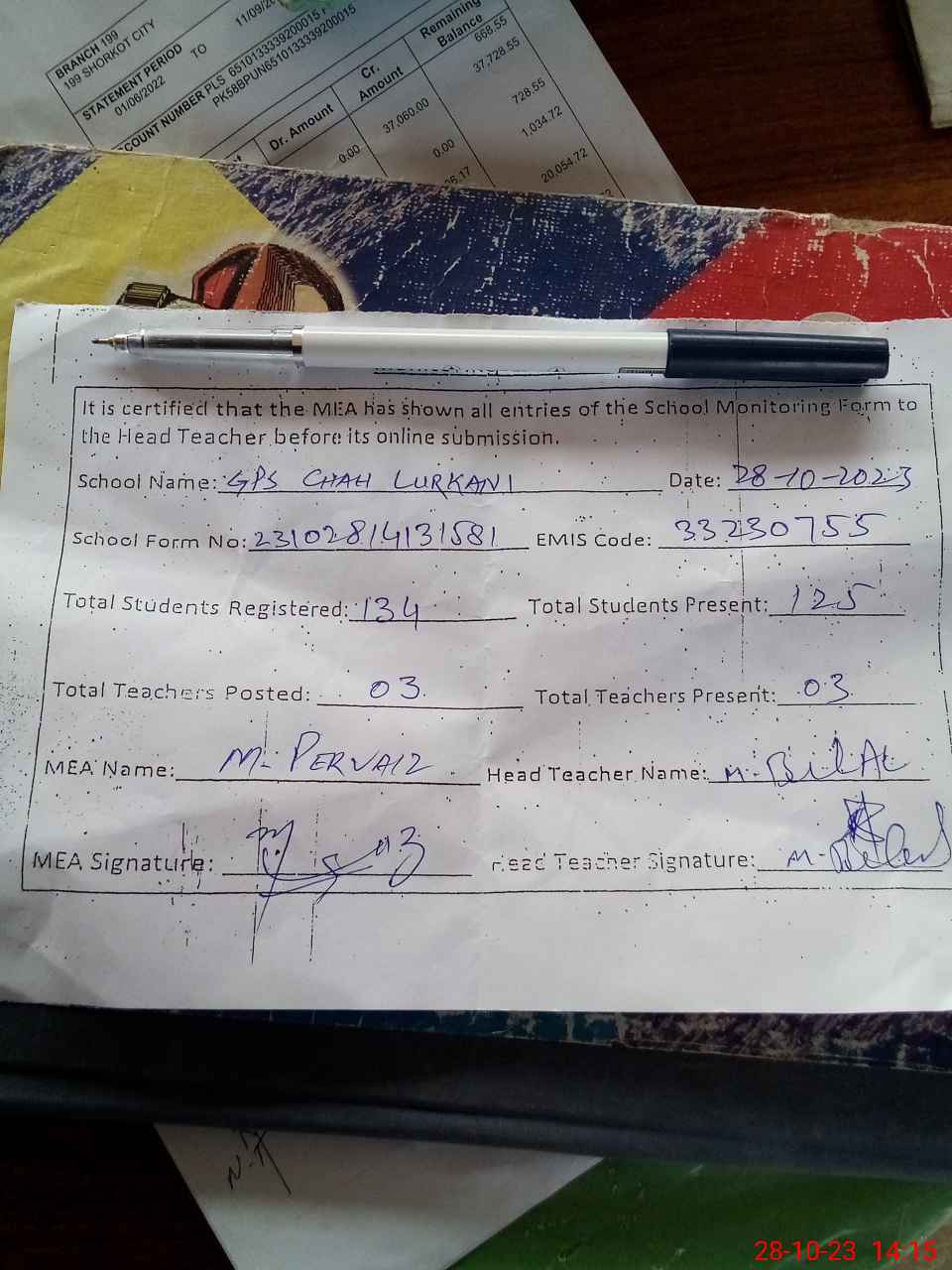 | EMIS Code: 33230755 | Name of School: GPS CHAH LURKANI | |||