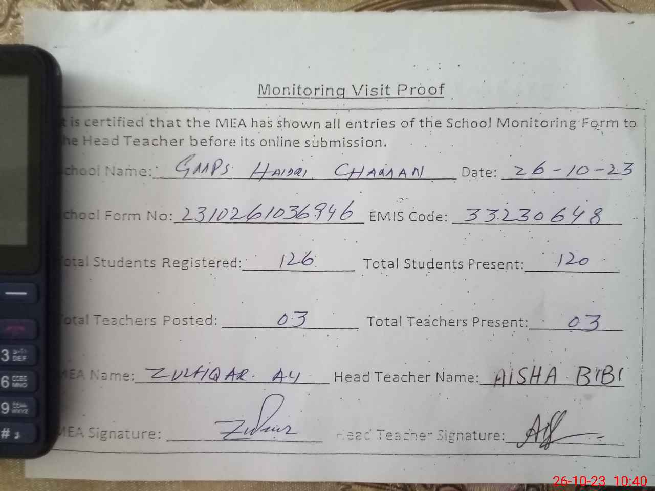 | Attendance Register | Head Teacher | MEA with School | Visit Proof |