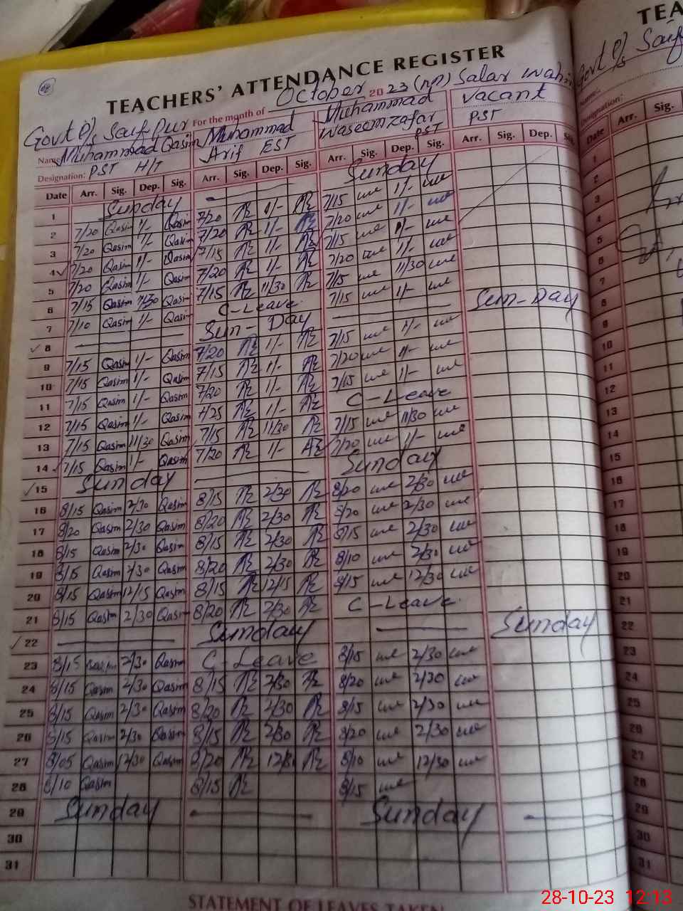 | CNIC | Full Name | Designation | R/C | Absence During Last Calender Month |