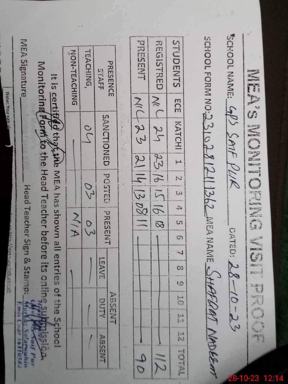 | Monitoring Date: 28-10-2023 | Start Time: 28-10-2023 11:30 AM | End Time: 28-10-2023 12:14 PM | Name of MEA: Sh**** Na**** | |
