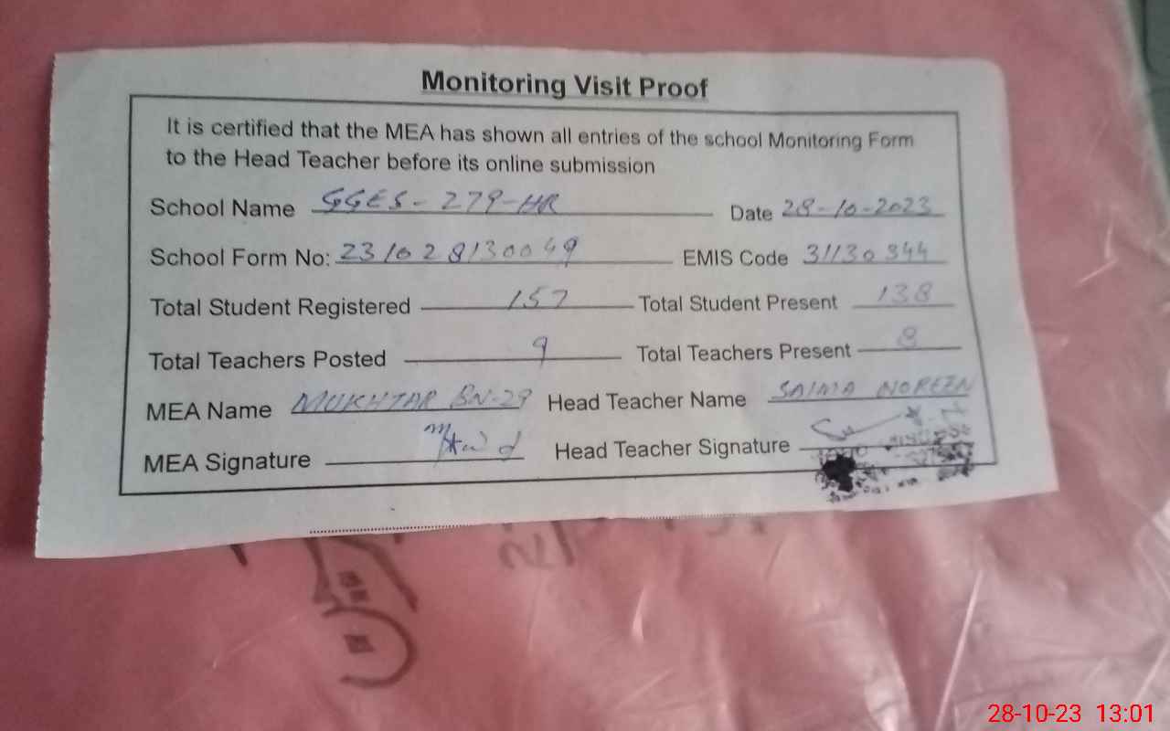 | Attendance Register | Head Teacher | MEA with School | Visit Proof |