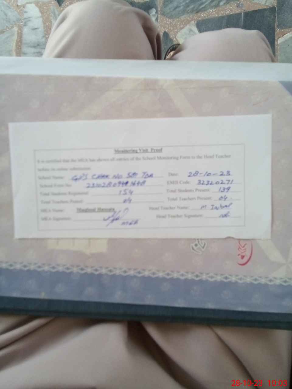 | Name: M.**** Designation: (School Headmaster's/Headmistress's) PST Phone/Cell Number: 03**** |