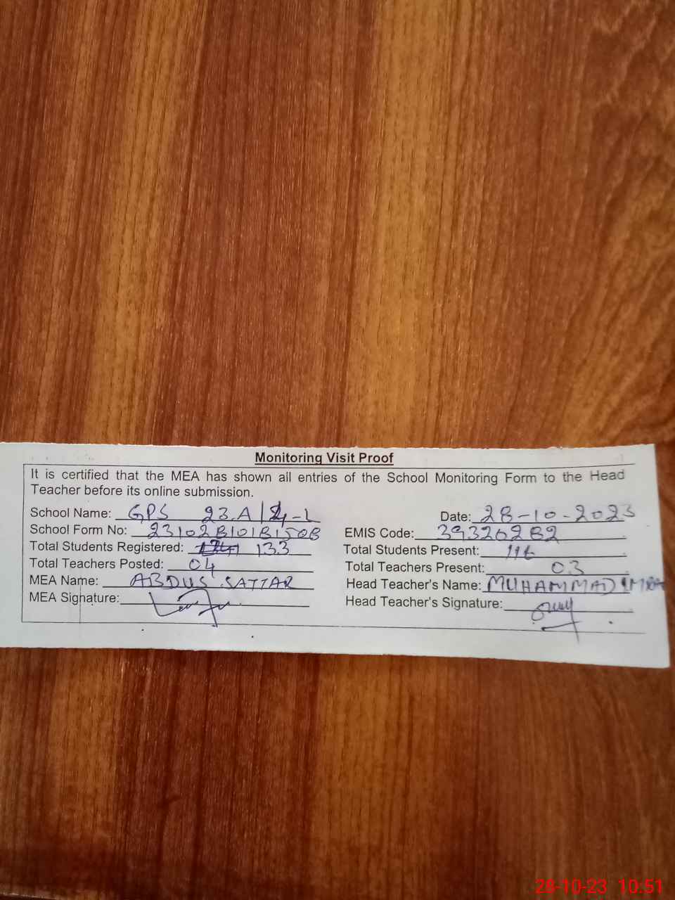 | Attendance Register | Head Teacher | MEA with School | Visit Proof |