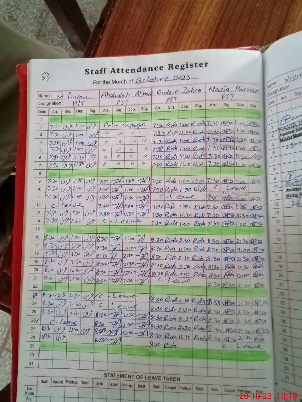 | Leave | Duty | Absent | Maternity | Medical | Ex- Pak |