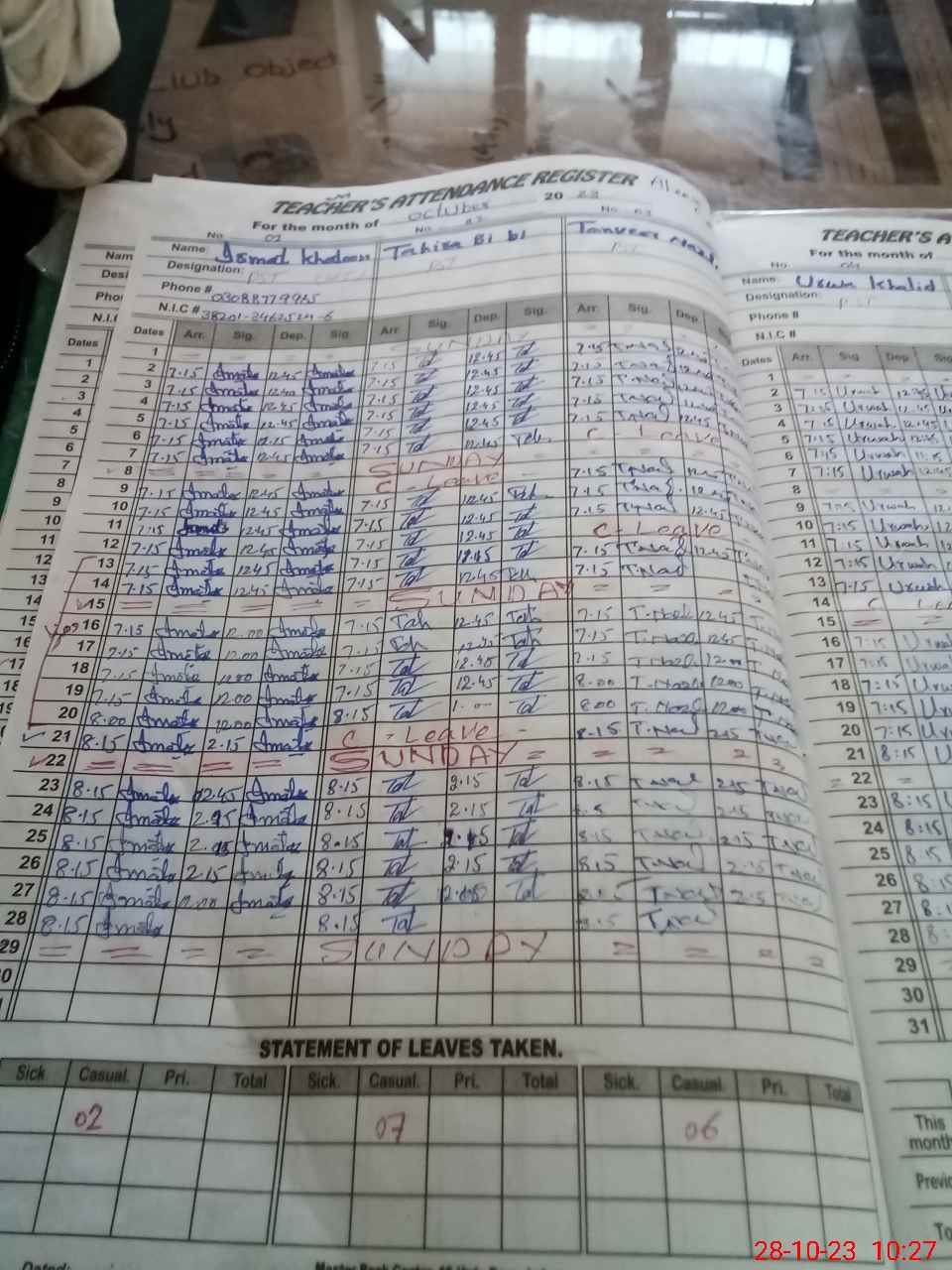 | CNIC | Full Name | Designation | R/C | Absence During Last Calender Month |