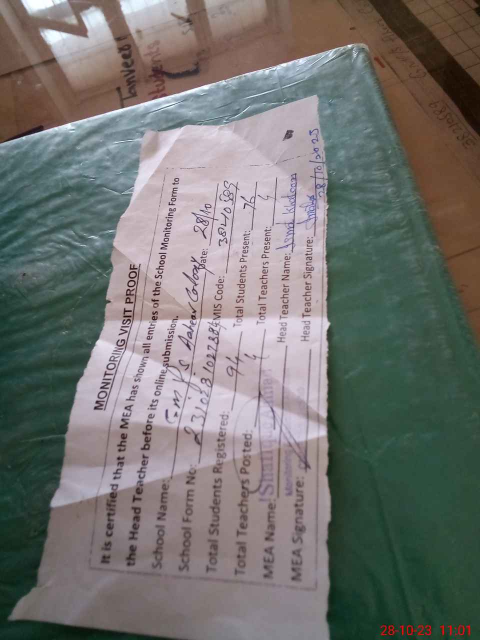 | Attendance Register | Head Teacher | MEA with School | Visit Proof |
