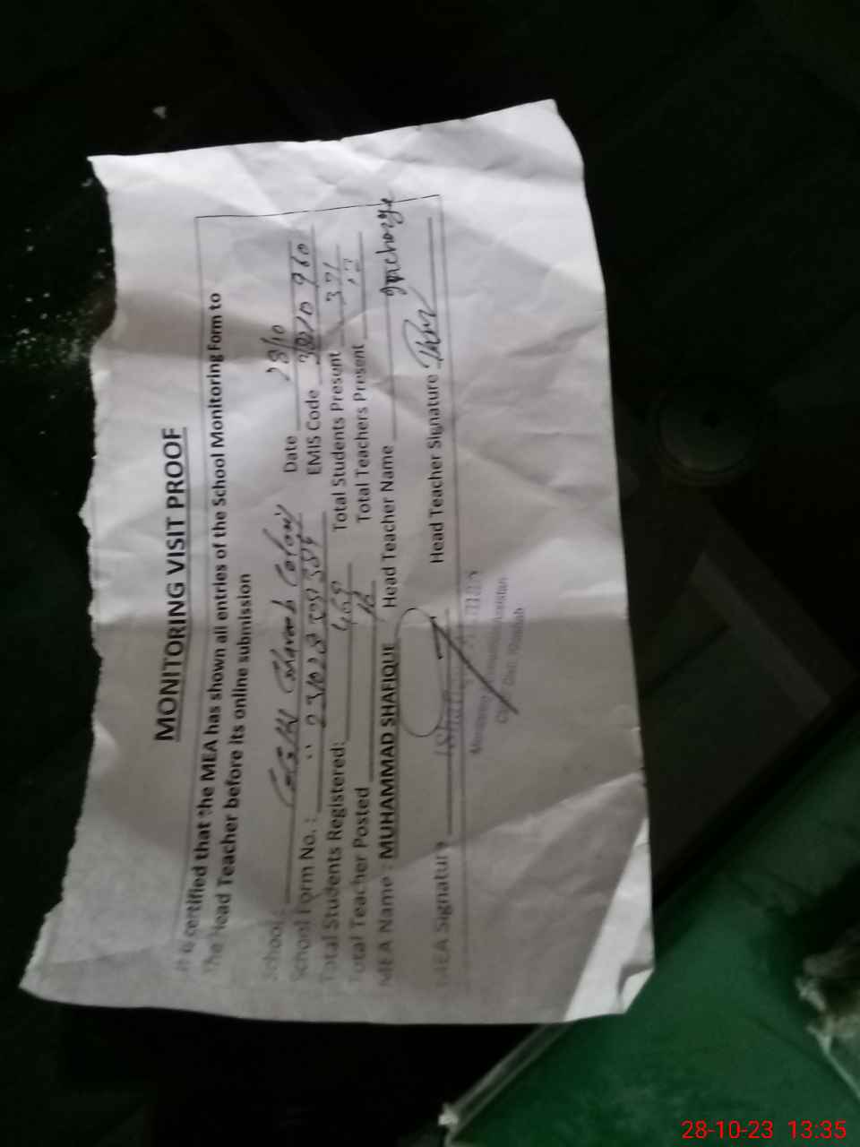 | Attendance Register | Head Teacher | MEA with School | Visit Proof |