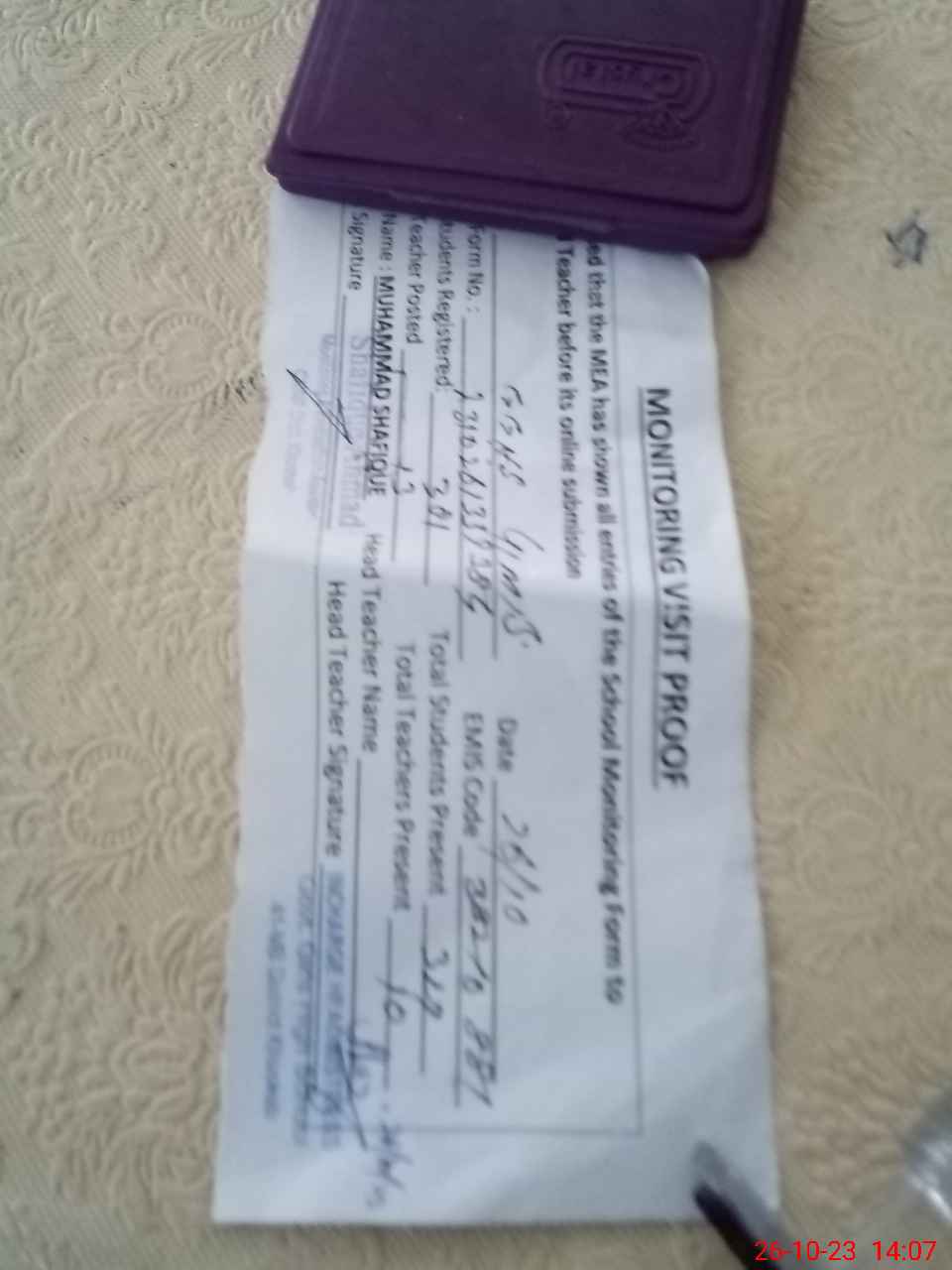 | Certified that this School was Inspected by the Undersigned MEA/DMO Today and the Information Stated Above is as Per Record. | |||||