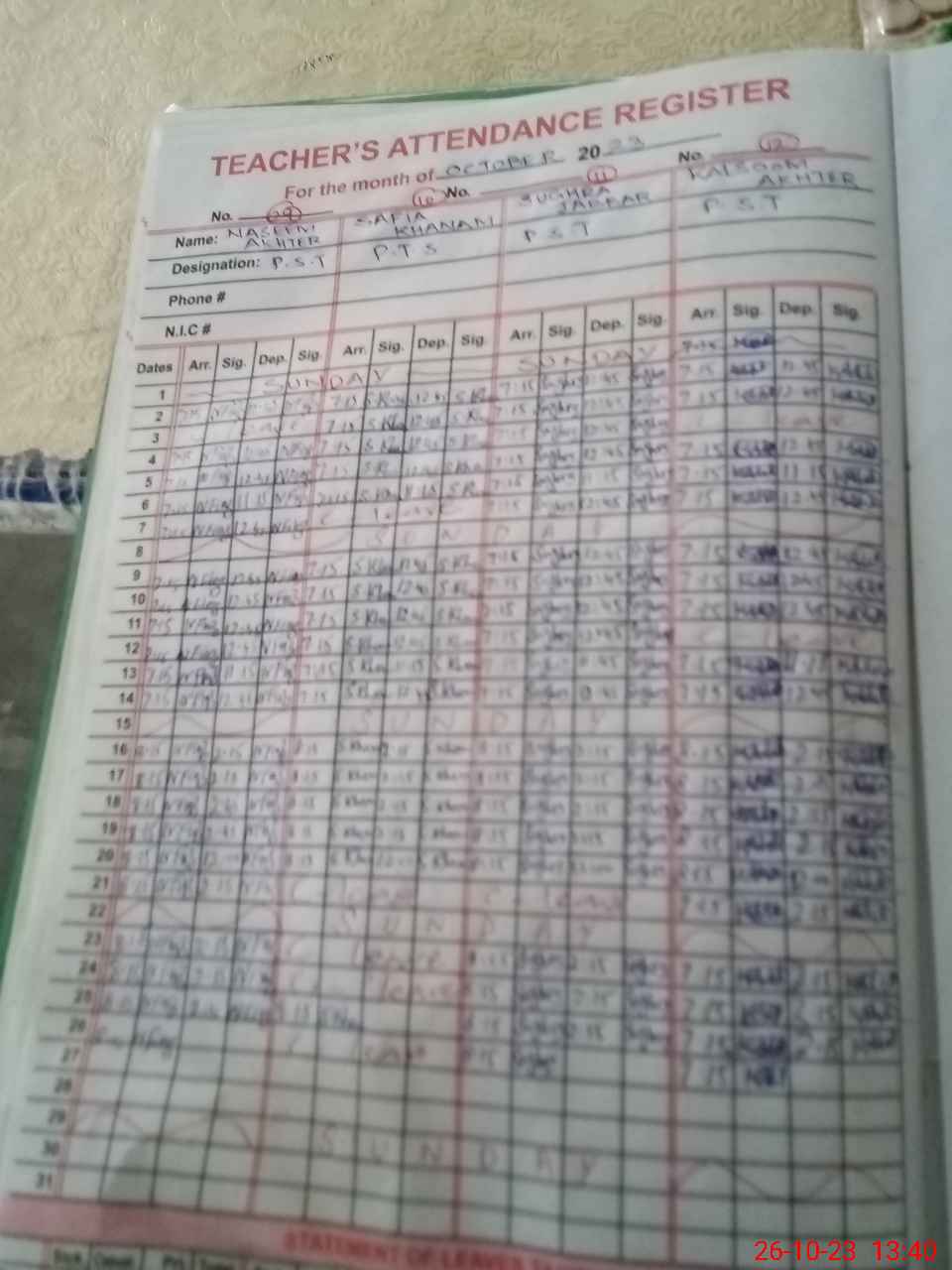 | CNIC | Full Name | Designation | R/C | Absence During Last Calender Month |