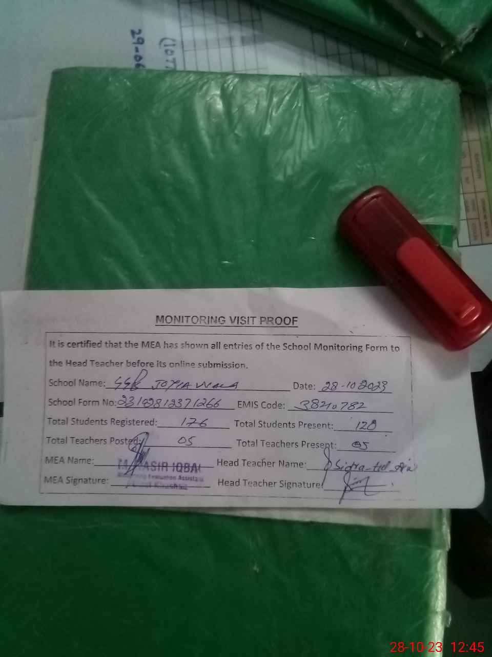 | Attendance Register | Head Teacher | MEA with School | Visit Proof |