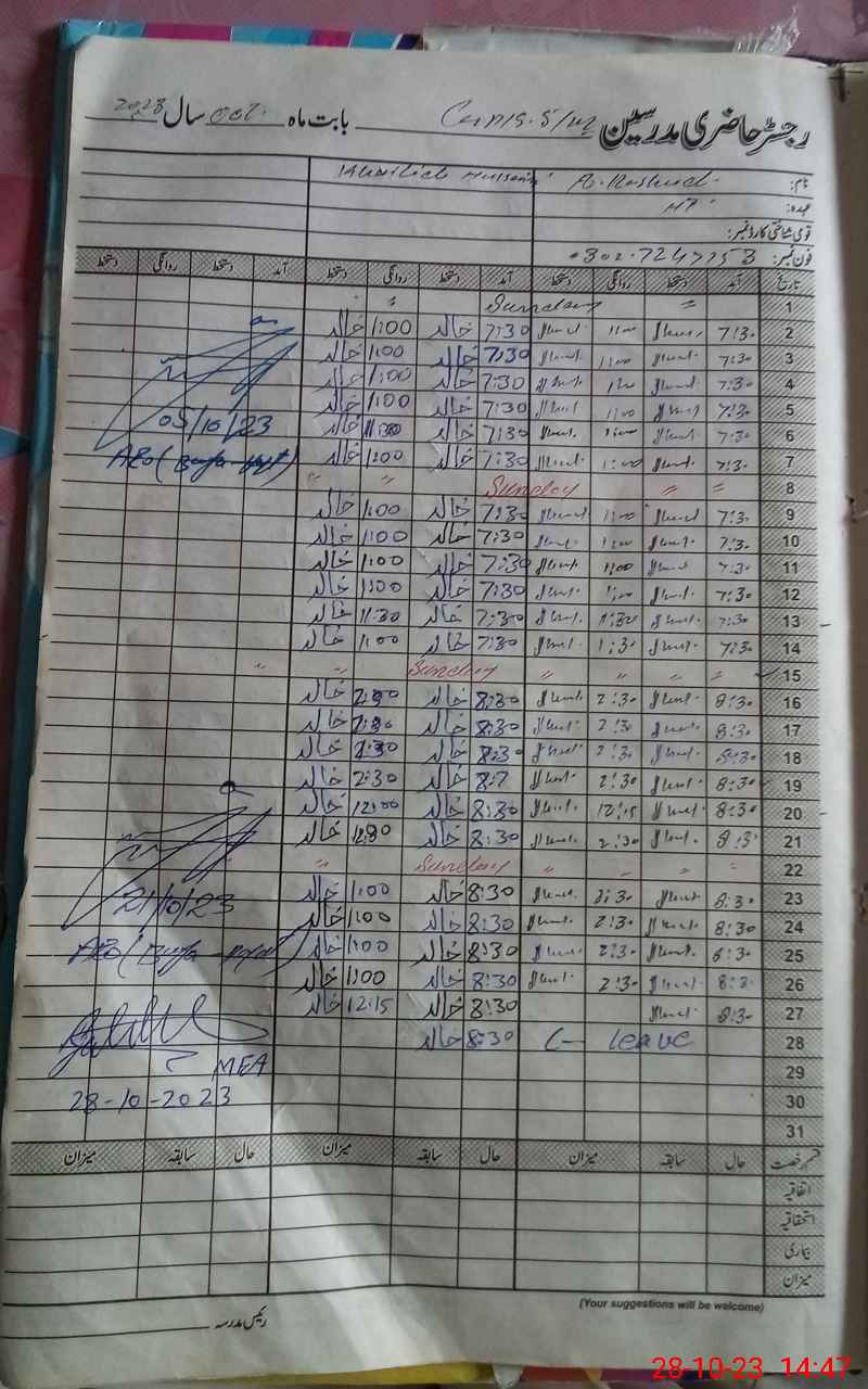 | CNIC | Full Name | Designation | R/C | Absence During Last Calender Month |