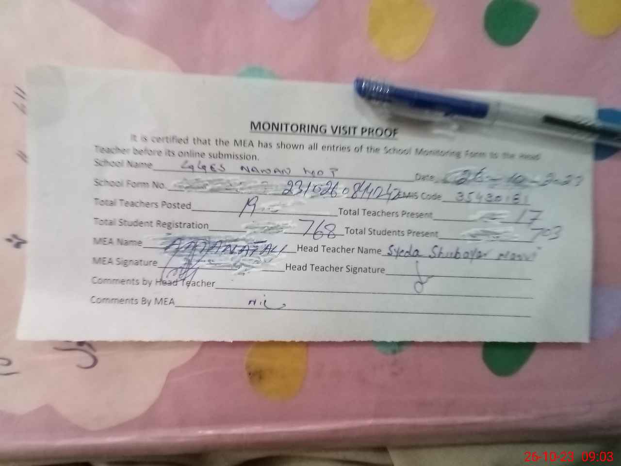 | Attendance Register | Head Teacher | MEA with School | Visit Proof |