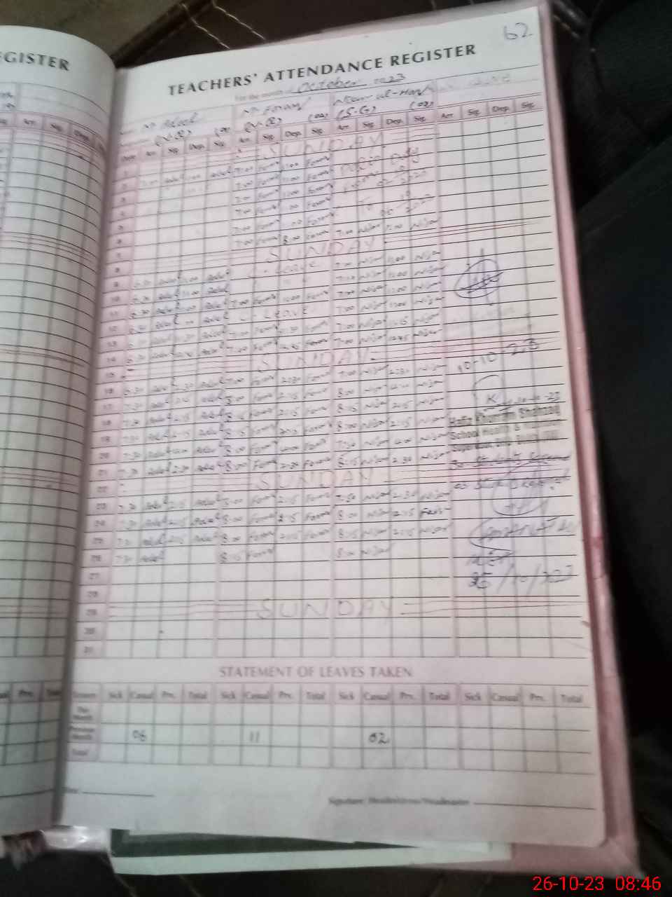 | Remarks (Use Separate Page if Required): EST Iqra Ameen and EST Sidhra Ashraf has gone on meterinity leave without sanctioned leave 15 August 2023 and 21August 2023 | |||||
