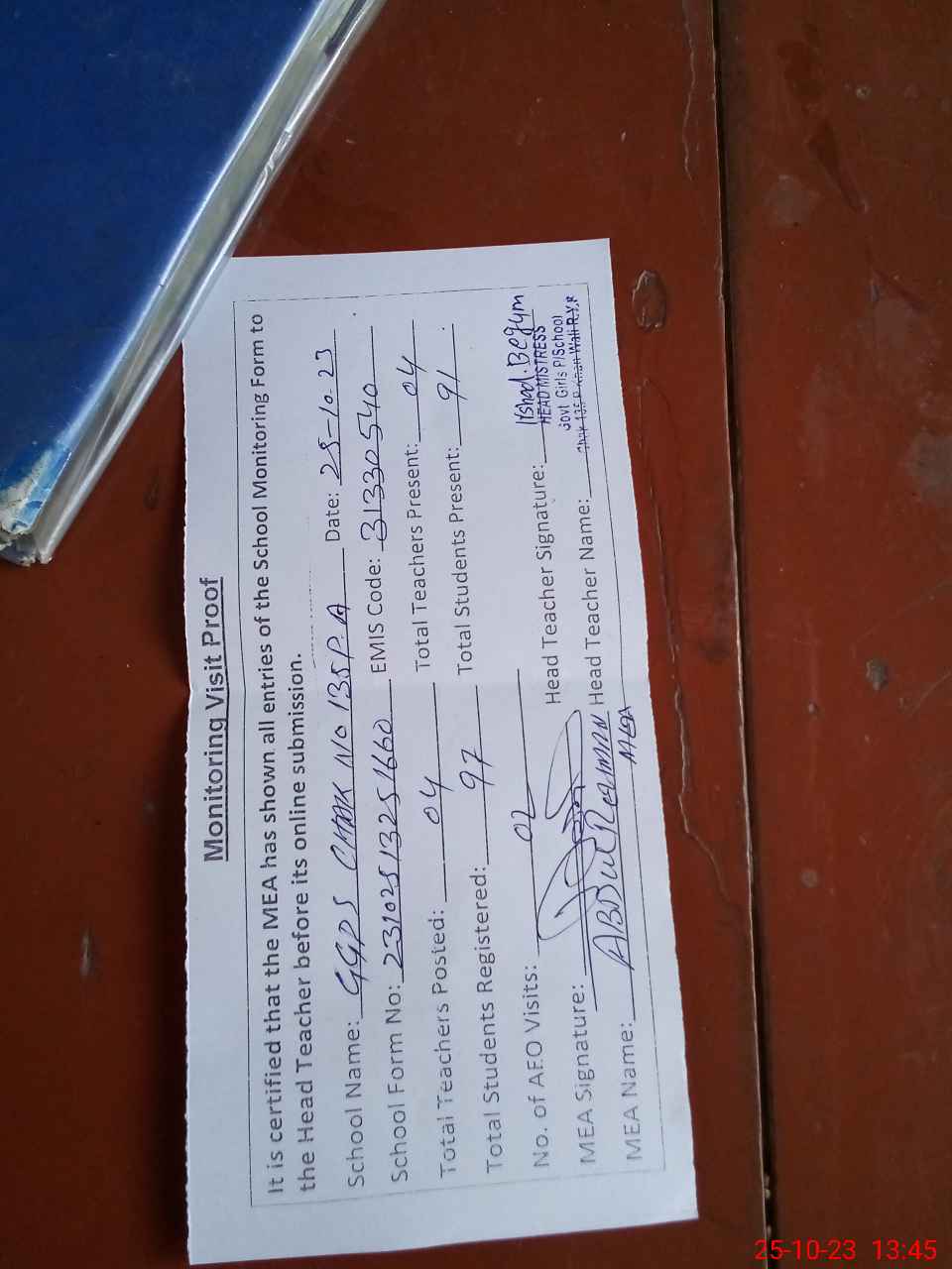 | EMIS Code: 31330540 | Name of School: GGPS CHAK 135/P KHAN WALI | |||