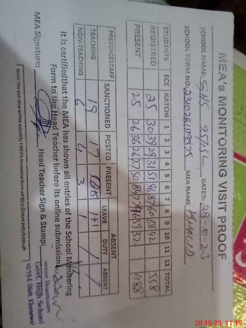 | Attendance Register | Head Teacher | MEA with School | Visit Proof |