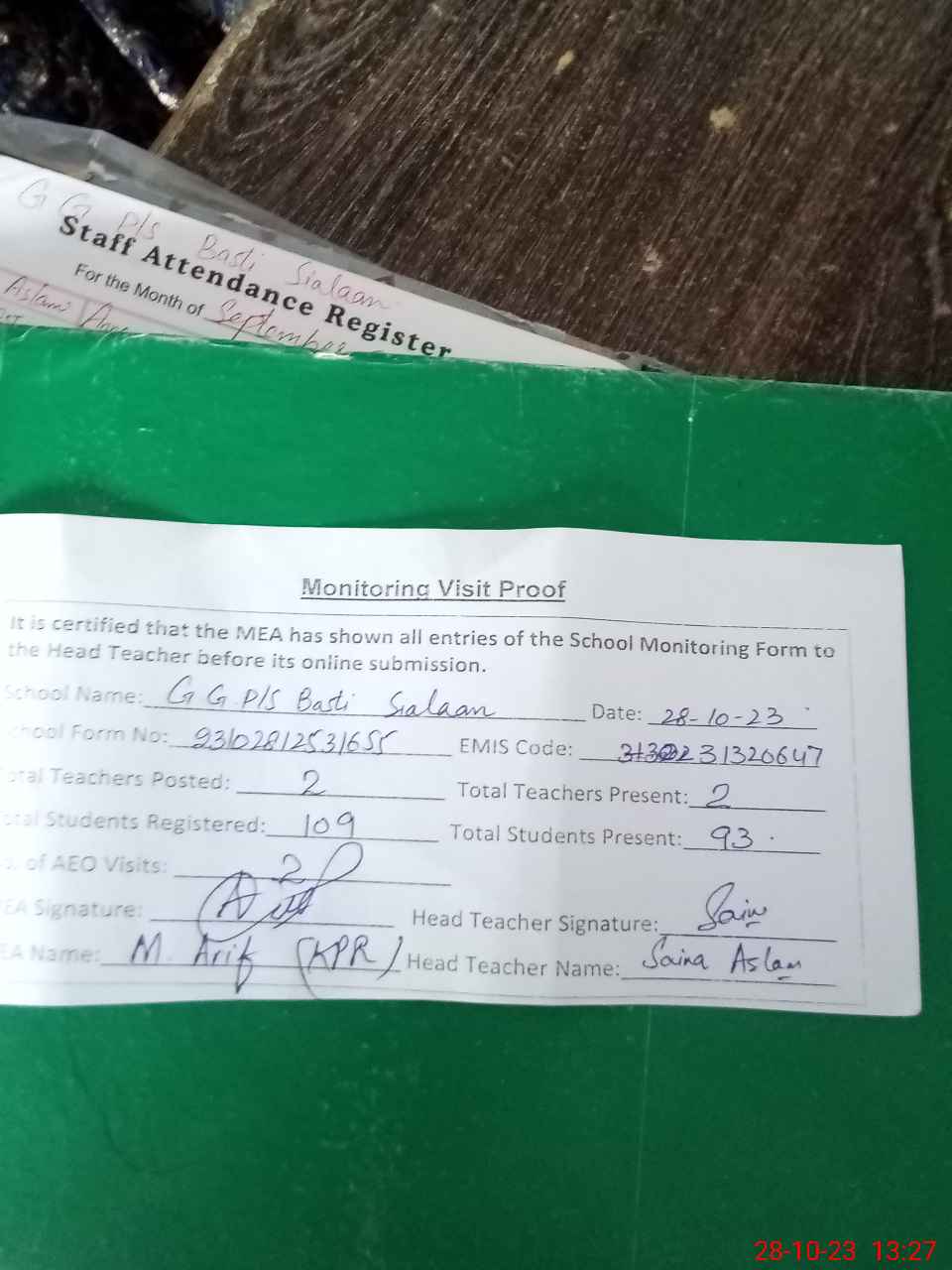 | Attendance Register | Head Teacher | MEA with School | Visit Proof |