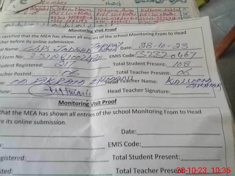 | Monitoring Date: 28-10-2023 | Start Time: 28-10-2023 10:01 AM | End Time: 28-10-2023 10:37 AM | Name of MEA: M.Ak**** Al**** | |