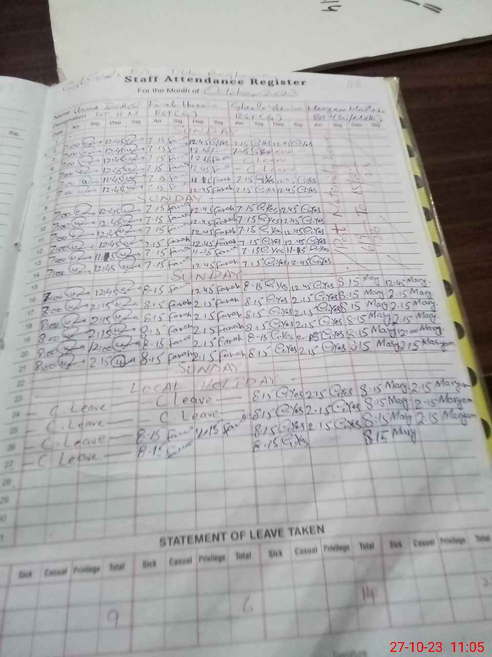 | CNIC | Full Name | Designation | R/C | Absence During Last Calender Month |