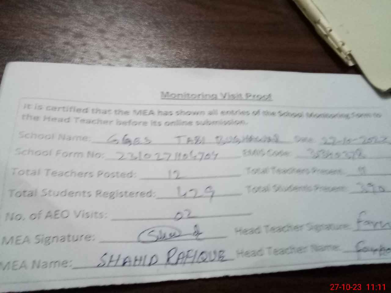 | Attendance Register | Head Teacher | MEA with School | Visit Proof |