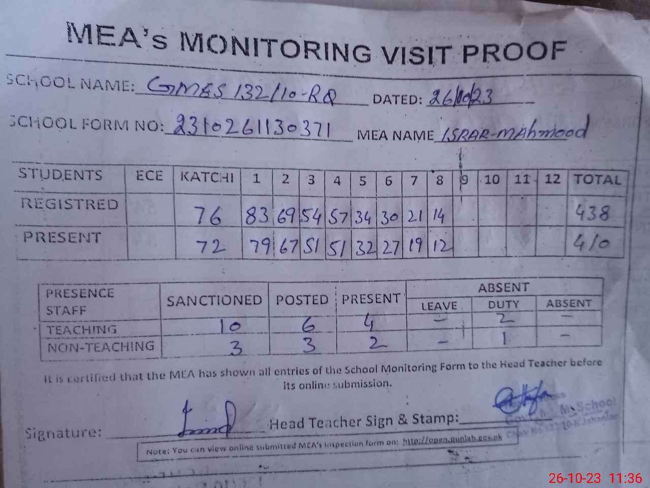 | Attendance Register | Head Teacher | MEA with School | Visit Proof |