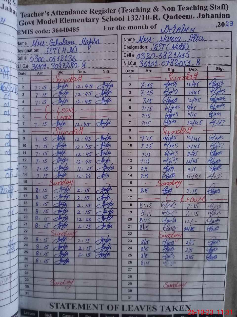 | CNIC | Full Name | Designation | R/C | Absence During Last Calender Month |