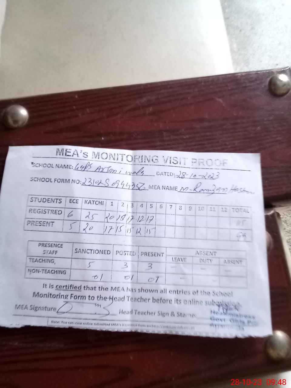 | Attendance Register | Head Teacher | MEA with School | Visit Proof |