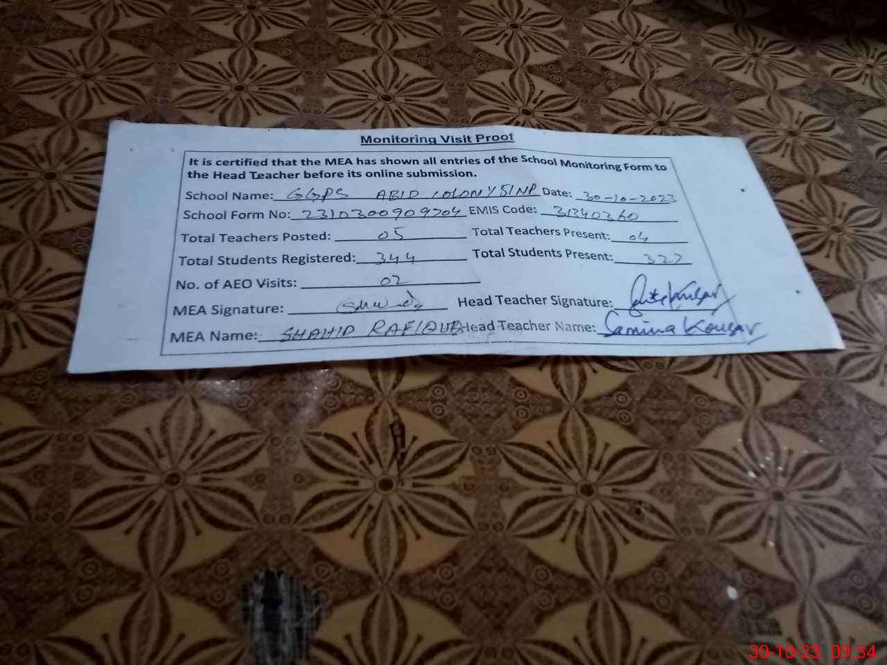 | Attendance Register | Head Teacher | MEA with School | Visit Proof |