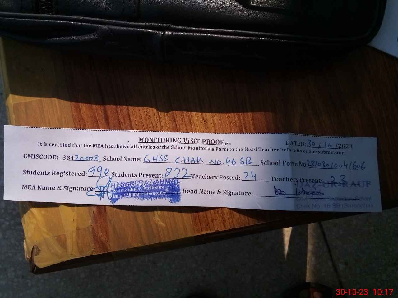 | EMIS Code: 38420003 | Name of School: GHSS CHAK NO.46 SB | |||