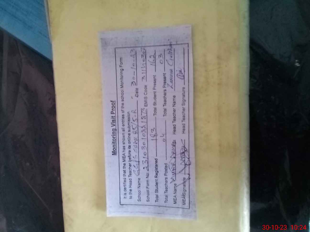 | Attendance Register | Head Teacher | MEA with School | Visit Proof |