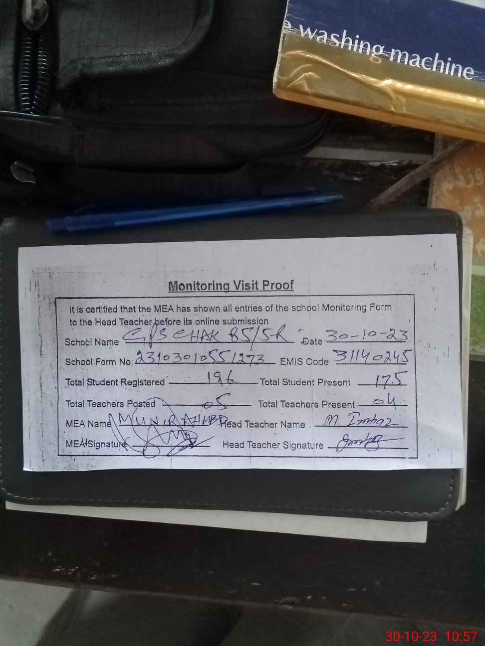 | Attendance Register | Head Teacher | MEA with School | Visit Proof |