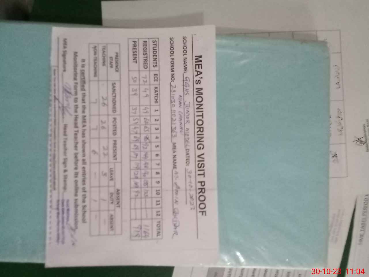 | Attendance Register | Head Teacher | MEA with School | Visit Proof |