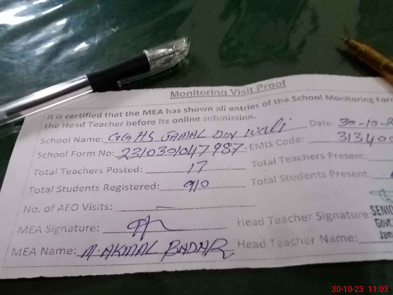 | Attendance Register | Head Teacher | MEA with School | Visit Proof |