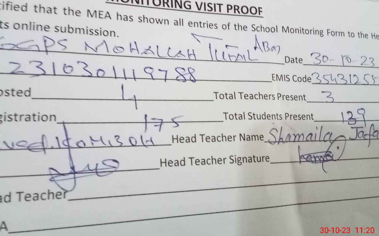 | Name: SH**** JA**** Designation: (School Headmaster's/Headmistress's) PST Phone/Cell Number: 03**** |