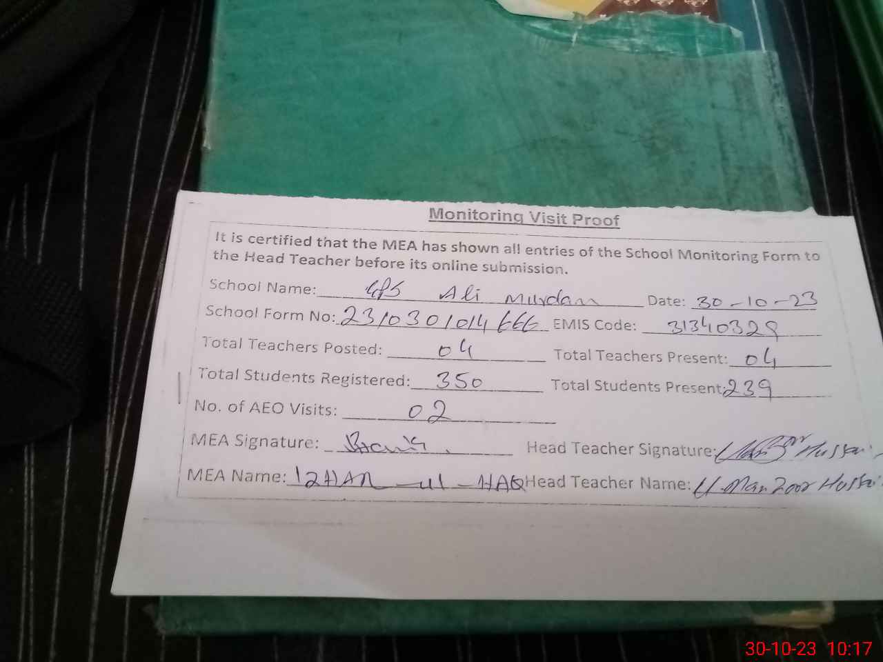 | Attendance Register | Head Teacher | MEA with School | Visit Proof |