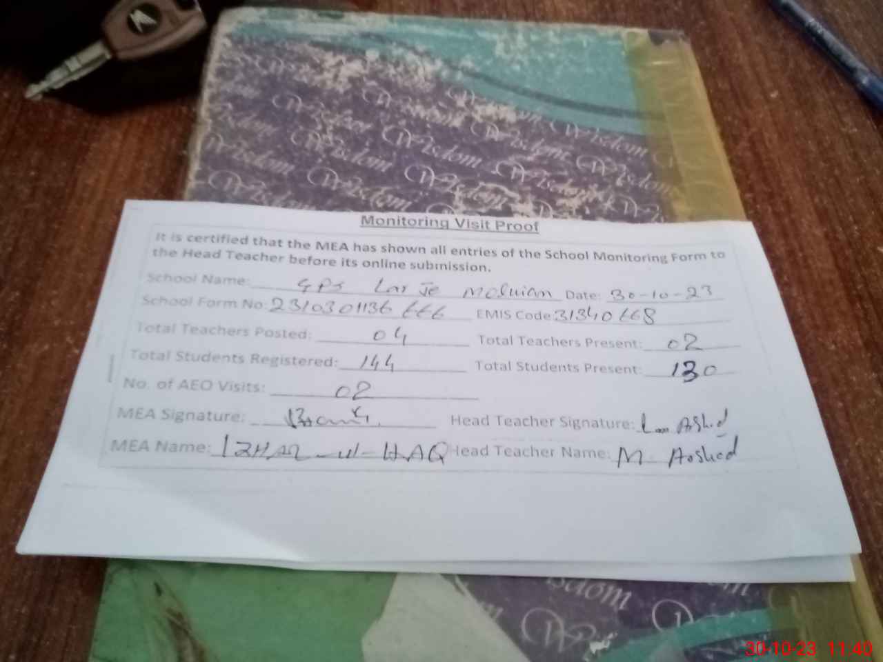 | Attendance Register | Head Teacher | MEA with School | Visit Proof |