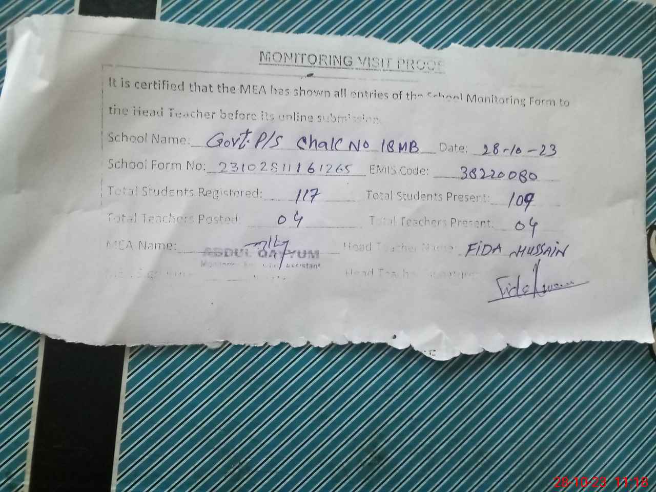 | EMIS Code: 38220080 | Name of School: GPS CHAK NO. 18/MB | |||