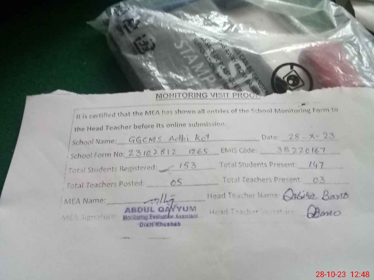 | Attendance Register | Head Teacher | MEA with School | Visit Proof |
