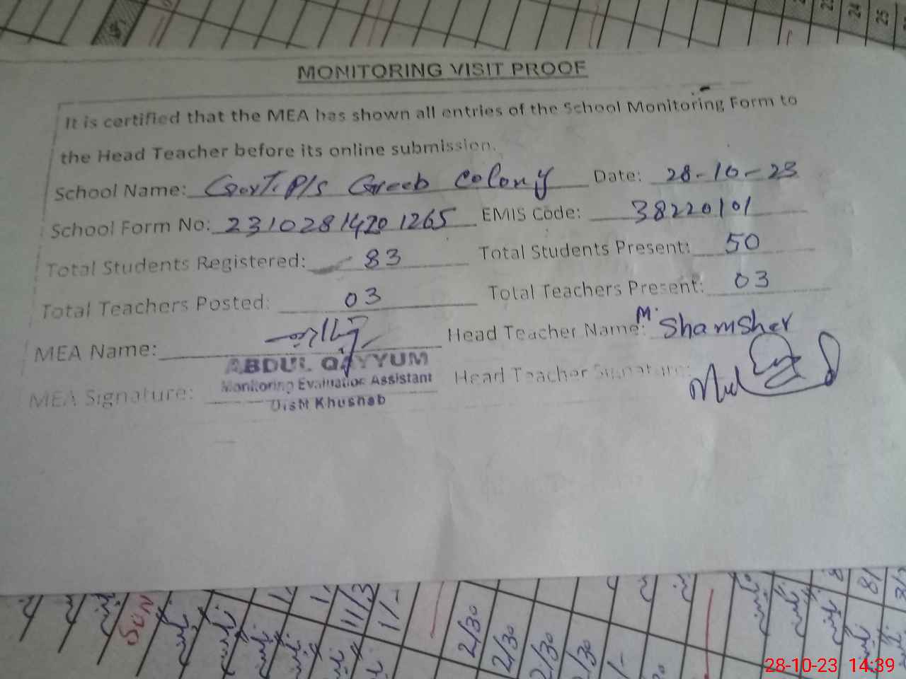 | EMIS Code: 38220101 | Name of School: GPS GHEREEB COLONY, ADHI KOT | |||