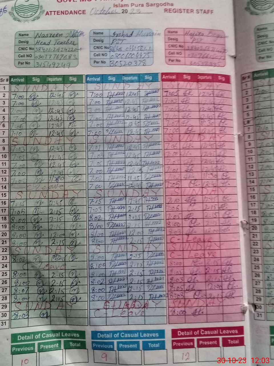 | CNIC | Full Name | Designation | R/C | Absence During Last Calender Month |