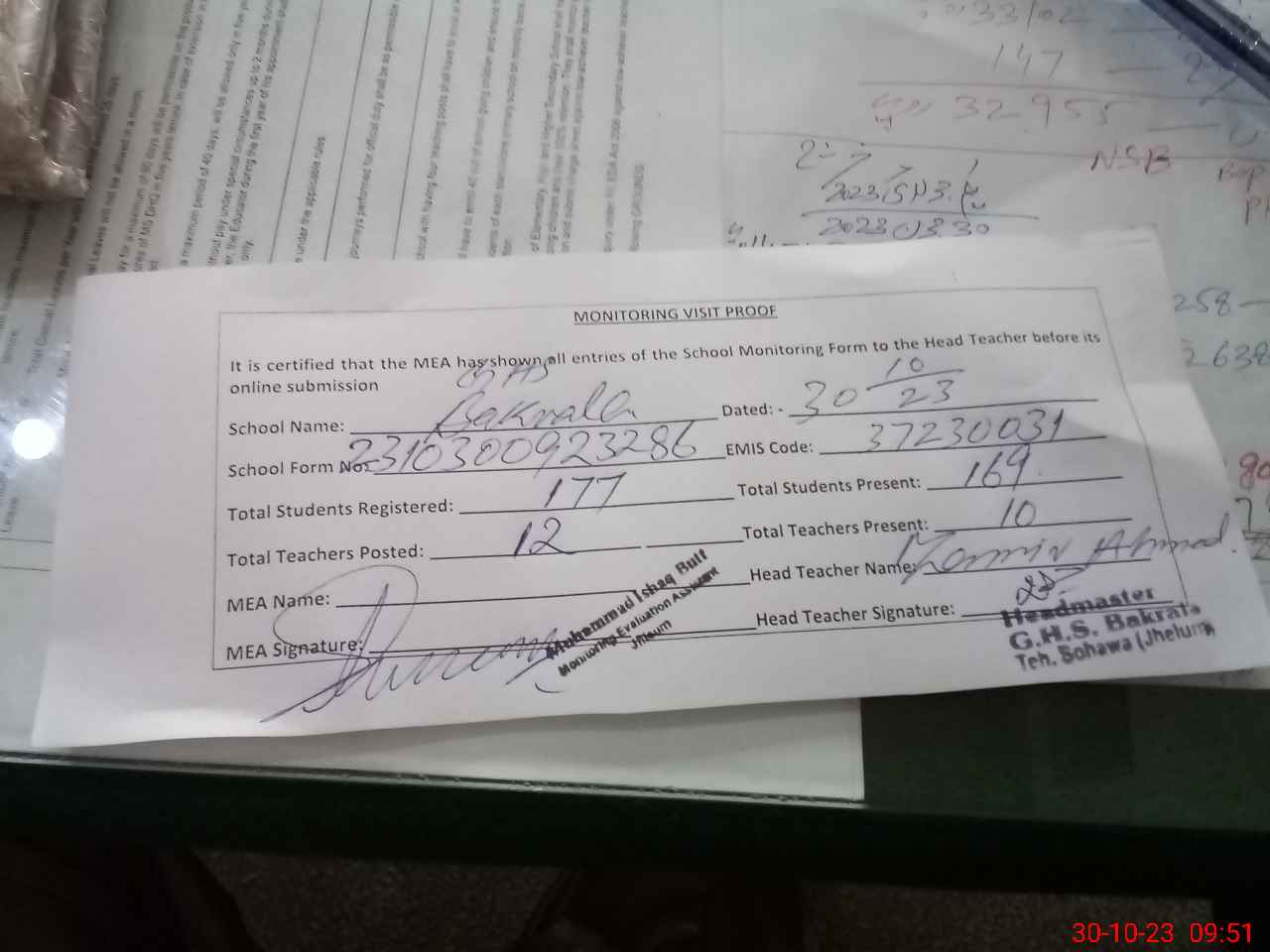 | Attendance Register | Head Teacher | MEA with School | Visit Proof |