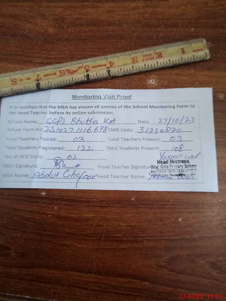 | Attendance Register | Head Teacher | MEA with School | Visit Proof |