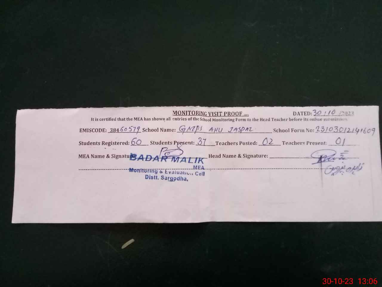 | Attendance Register | Head Teacher | MEA with School | Visit Proof |