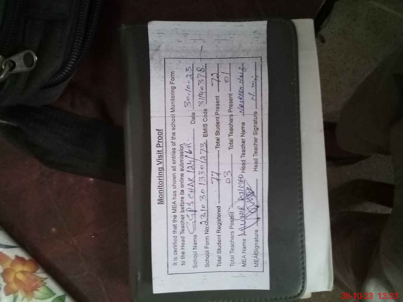| Attendance Register | Head Teacher | MEA with School | Visit Proof |