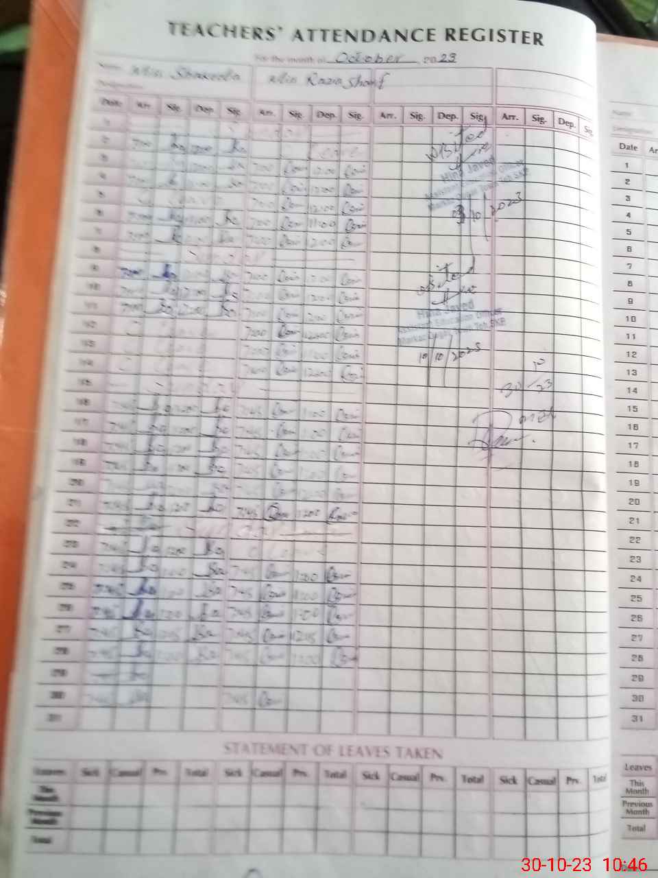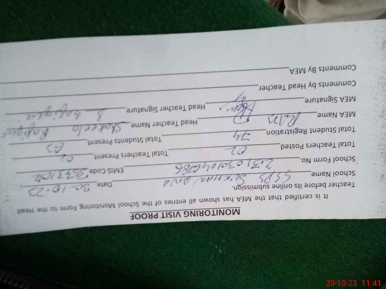 | Attendance Register | Head Teacher | MEA with School | Visit Proof |
