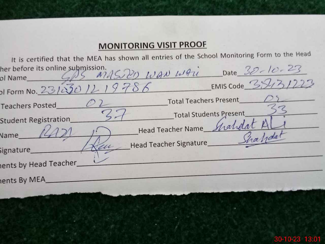| Attendance Register | Head Teacher | MEA with School | Visit Proof |