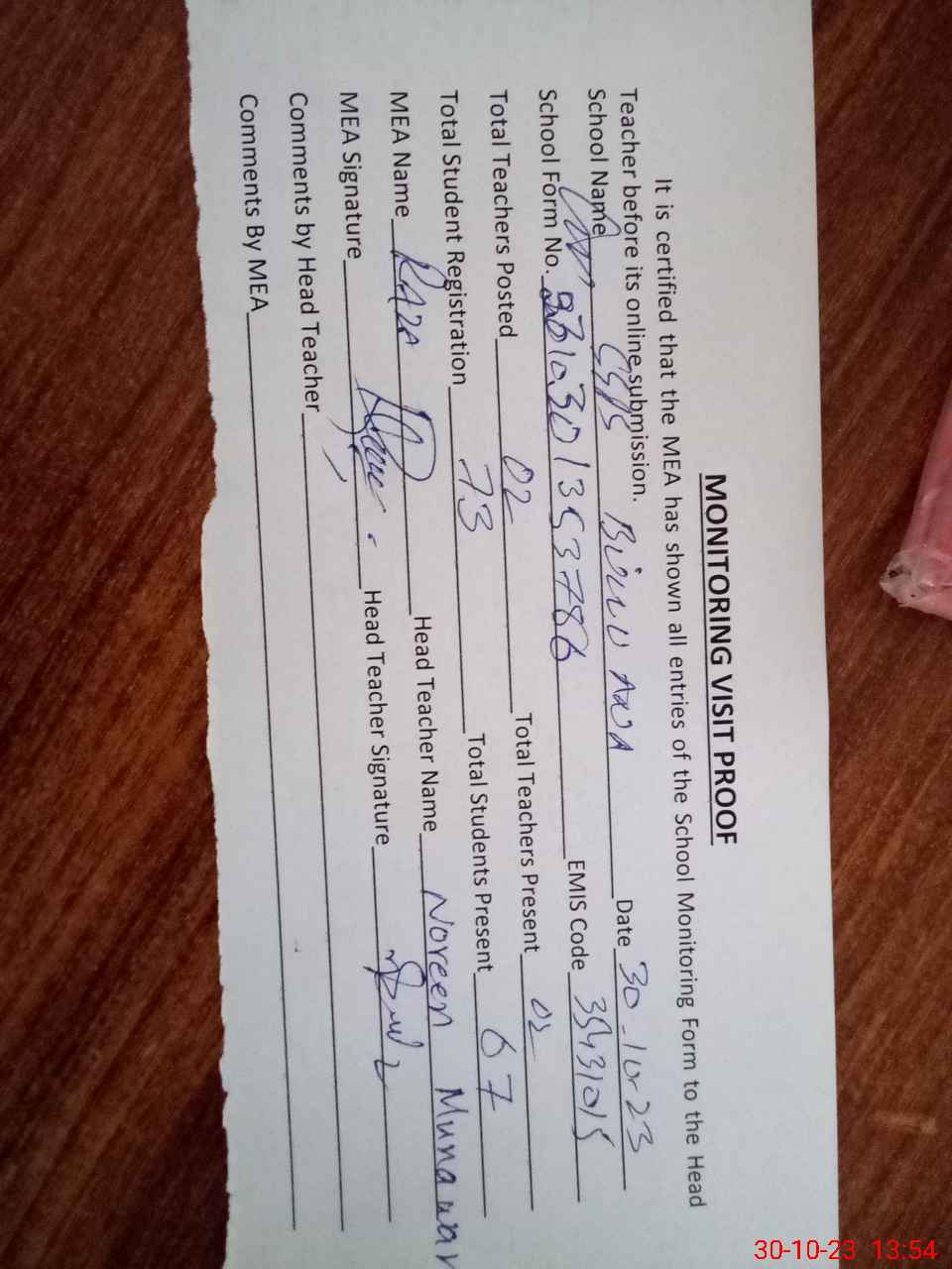 | Attendance Register | Head Teacher | MEA with School | Visit Proof |