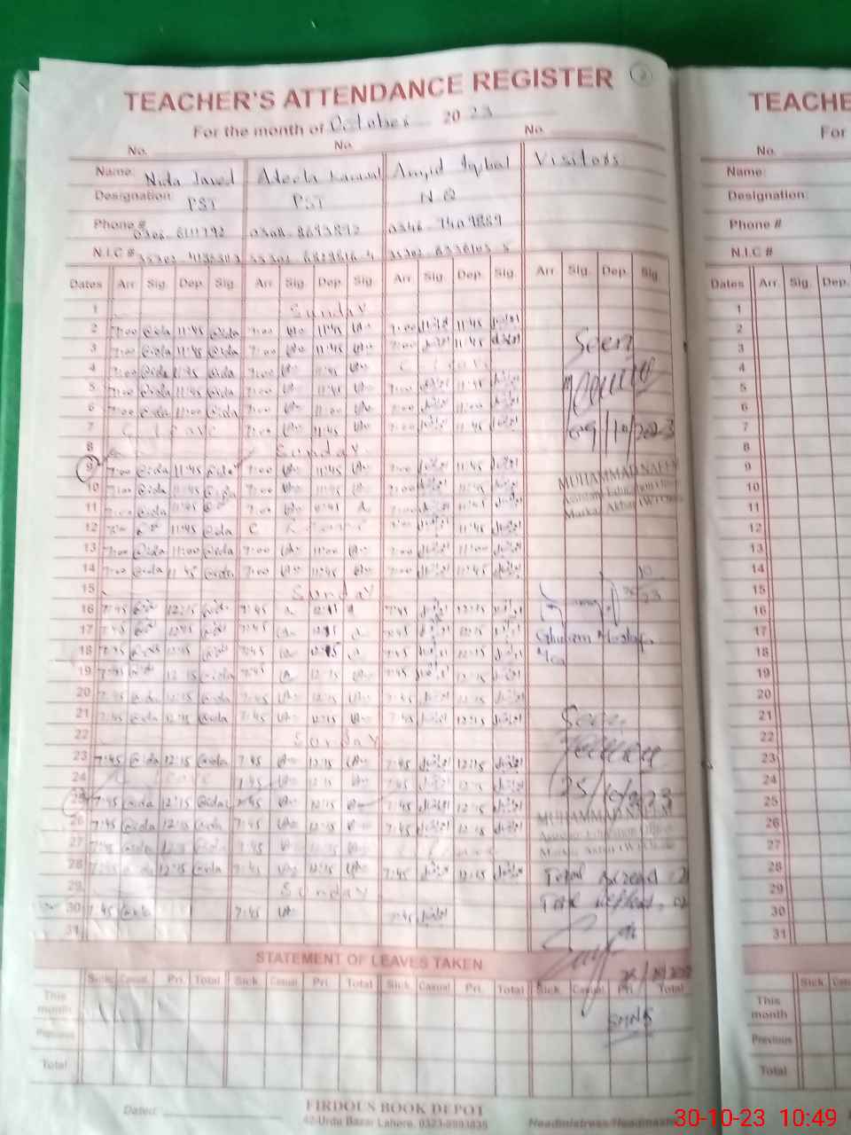 | CNIC | Full Name | Designation | R/C | Absence During Last Calender Month |