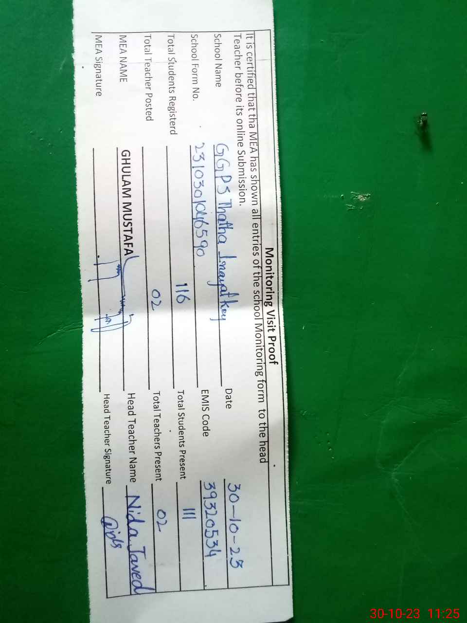 | Attendance Register | Head Teacher | MEA with School | Visit Proof |
