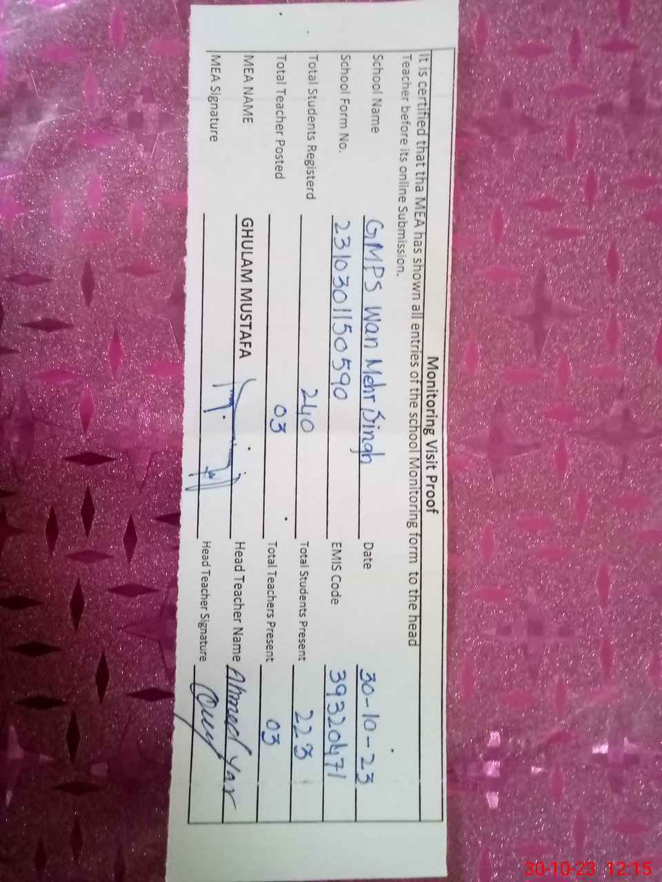 | EMIS Code: 39320471 | Name of School: GMPS WAN MEHR SINGH | |||